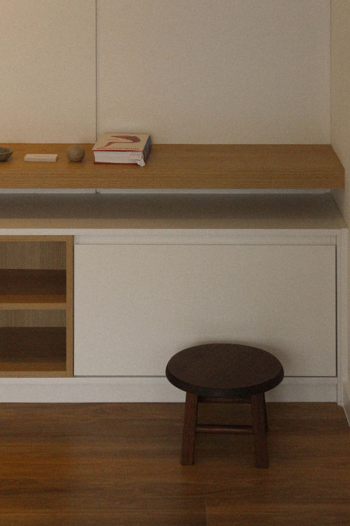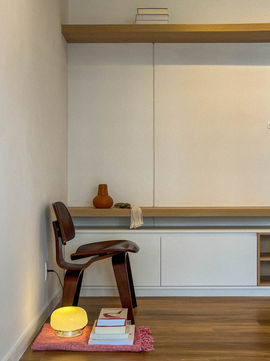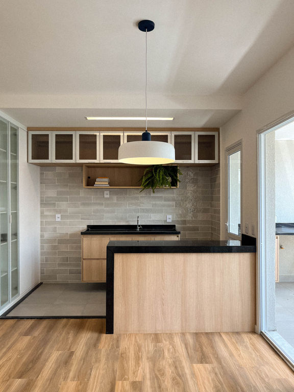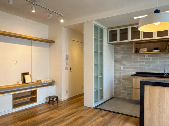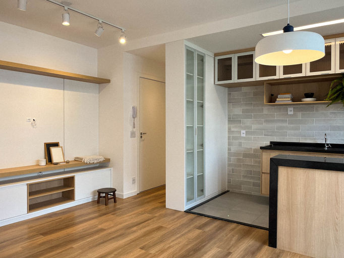 nosso objetivo foi preparar o imóvel recém entregue pela construtora para uma futura locação. optamos por aproveitar os revestimentos e bancadas originais e focamos nossa proposta em revestimentos pontuais, forros, iluminação e marcenaria.