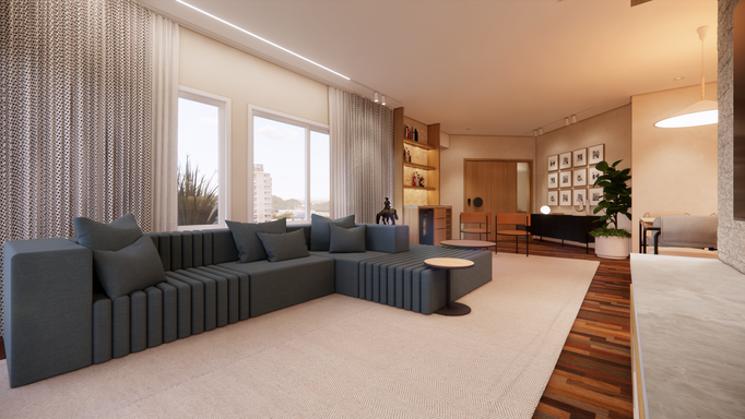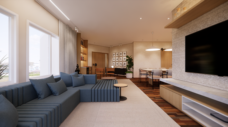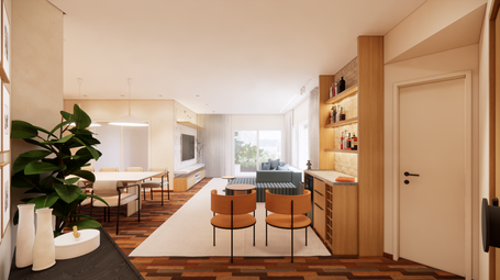 o apartamento monet é lar de uma família alegre e receptiva. o hall, o lavabo e as salas da área social foram repensados de forma a proporcionar conforto e bem-estar com estilo contemporâneo, utilizando uma base de tons neutros e elementos pontuais com cor, aliado aos revestimentos existentes do piso de madeira e em granito.