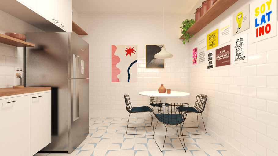 a pintura branca, o tijolo aparente, o piso vinílico, o mobiliário contemporâneo e a iluminação são elementos cruciais para a concretização do projeto.