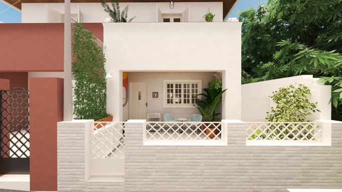 o ponto de partida do projeto foi a recuperação da fachada por meio da valorização de elementos já presentes na residência, como a sua volumetria, a pintura branca, as esquadrias em madeira e detalhes em serralheria.