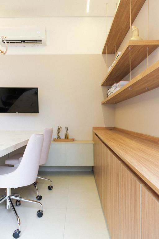 à partir de uma paleta de tons claros e rosados, criou-se um ambiente que equilibra delicadeza e funcionalidade.
