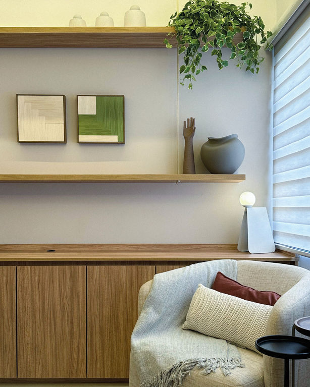 texturas e acabamentos foram cuidadosamente selecionados, combinando elementos madeirados e marmorizados para conferir profundidade e elegância ao conjunto.
