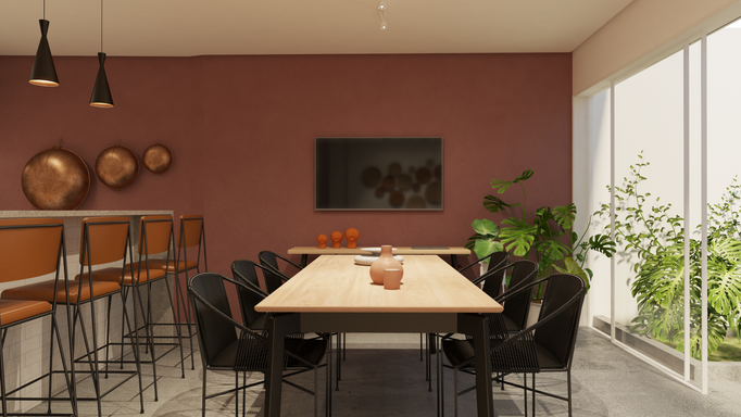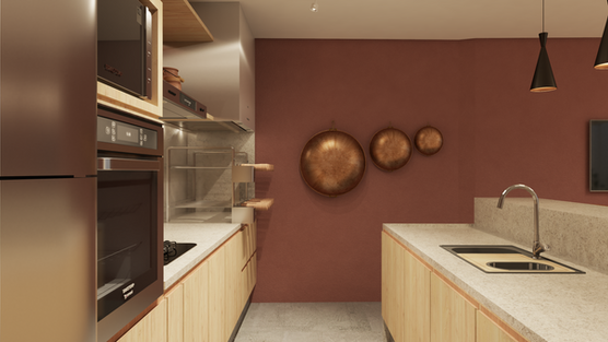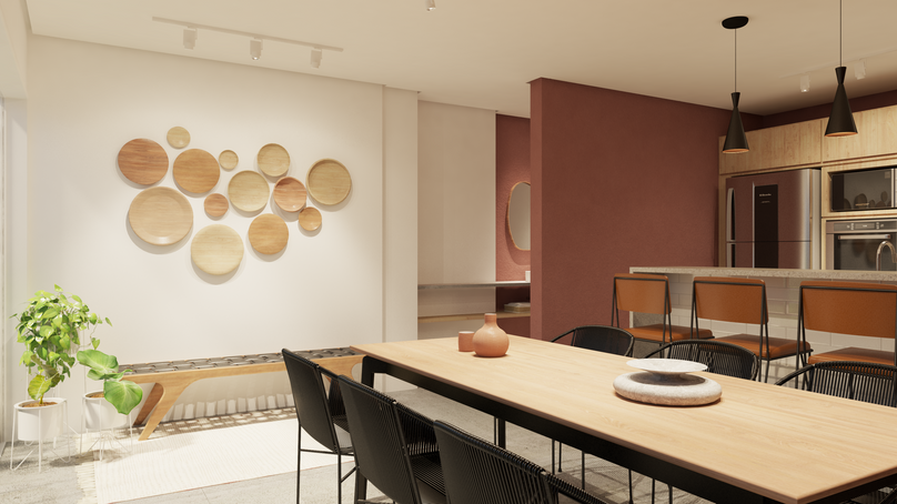 para isso, foi proposto o uso de cores em tons terrosos e o emprego de materais naturais como madeira e granito itaunas em contraponto com um ladrilho contemporâneo, piso em porcelenato cimento queimado, luminárias e trilhos aparentes.