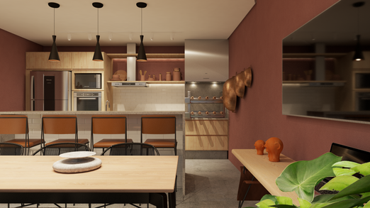 o projeto buscou trabalhar com uma materialidade que remete a cozinhas tradicionais em contraste com um estilo contemporâneo e industrial, solicitado pelo cliente.