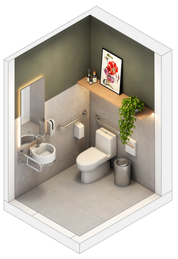 nos banheiros, foi proposto o uso de porcelanato cimento queimado no piso e à meia altura, criando um efeito de “caixa” reforçado pela pintura cinza esverdeado e pelas iluminações em tons quentes 3000k.