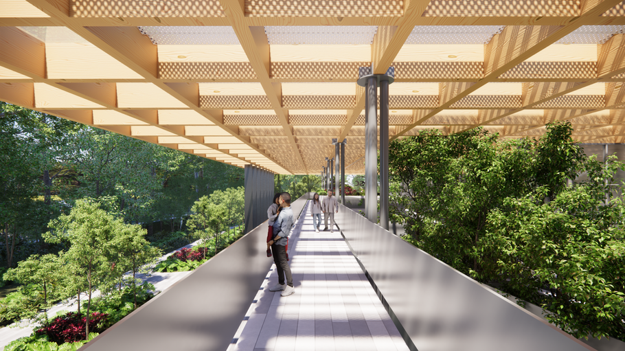 a proposta adota materiais e métodos construtivos que reforçam a integração entre arquitetura, natureza e eficiência. A cobertura em madeira laminada colada (MLC), estruturada em um sistema de grid e protegida por uma cobertura em vidro e um sistema de brises metálicos, permite a composição de volumes soltos e independentes, que conferem leveza visual e favorecem a ventilação e iluminação natural. As aberturas genorosas captam brisas e luz solar, reduzindo a dependência de sistemas artificiais e promovendo o conforto ambiental.